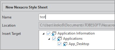 You must enter a XCSS file's "Name" and "Location." Moreover, XCSS files in the same location must have unique names. At "Insert Target," you must specify to which target you apply the XCSS.