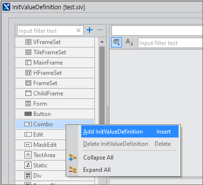 Creating an InitValue file will prompt the opening of the InitValueDefinition window, in which you can choose objects or components that you want to include in the InitValue file. Then, right-click an object or component to select the context menu [Add InitValueDefinition]. Otherwise, select an object or component and then click the "+" icon at the top of the pane.