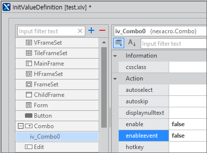 You can see an ID created under the relevant object or component, and also see that the right-hand pane is activated with the list of properties. In these circumstances, you can modify the InitValue file by specifying properties. Clicking the [Source] tab allows you to check the source codes of a created or modified InitValue file.