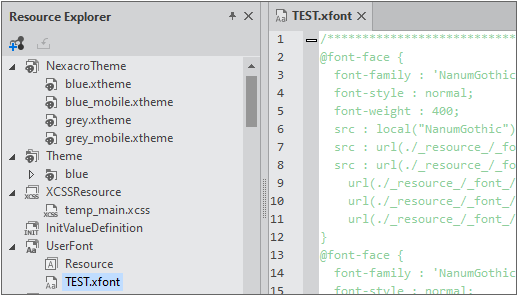 You can create a new UserFont file by accessing the menu [File > New > UserFont]. The extension of the file is .xfont, and the created file will be registered in the Resource Explorer.