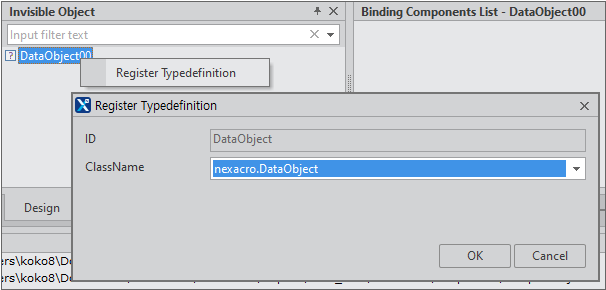 If you right-click a component that is not registered in TypeDefinition, you will see the pop-up menu [Register TypeDefinition]. Click it and then select a class name from the combo list opened from the pop-up box in order to register the relevant component.