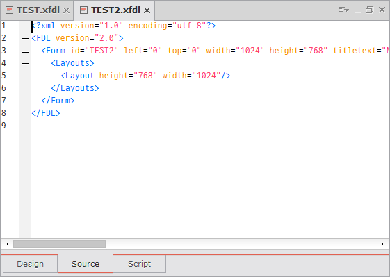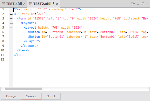 XML source codes will be created automatically when you arrange components or other objects on the Design window, change their properties, or add events. If you correct source codes directly through the Source editor, errors may occur since you can violate the predetermined object creation rules.
