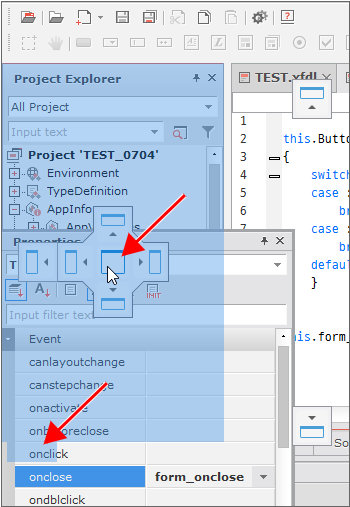 You can also dock a window in the Nexacro Studio UI to another window. You can arrange windows anywhere except the areas for the tool bar and the status bar. Also, you cannot move the Form Design Window.