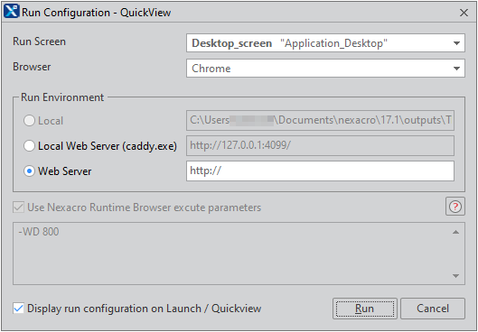 Assume that you select the Web Server option in the menu [Tools > Options > Project > Launch]. In this case, the below window will appear to allow you to enter a URL if you neither specify a preset URL nor select [Display run configuration on Launch / Quickview].