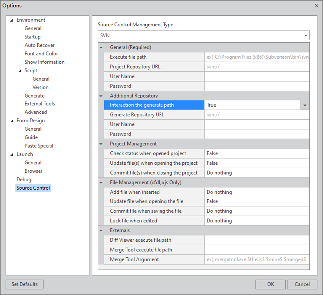 You must install a Subversion client to make the SVN option activated. Nexacro Studio identifies the installation of a Subversion client by checking the related entries in Windows Registry.
