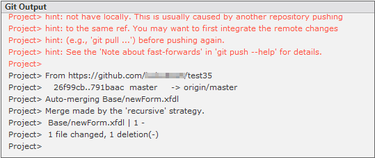 If a local repository and the connected remote repository have different versions of a file, the below-mentioned messages may be presented after commits are pushed from the local repository. In this case, the pull operation is performed first and then the push operation follows.