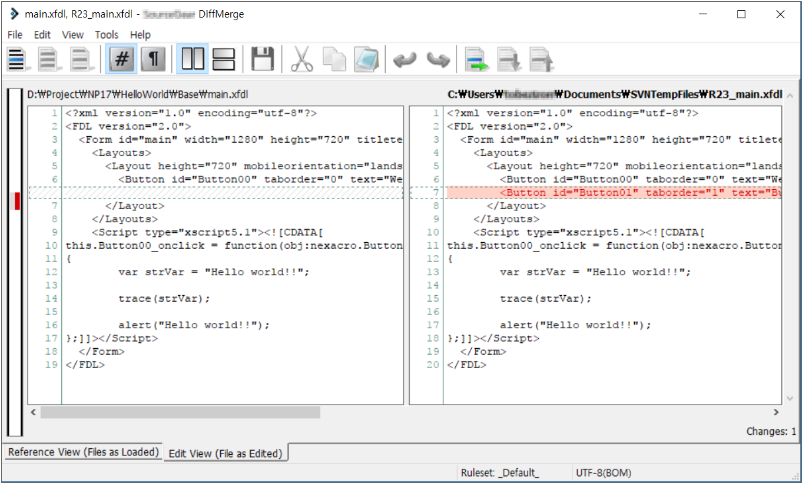While the XML editor of Nexacro Studio is good enough to resolve simple conflicts, it will be much better to use an external merge tool for complicated conflicts.