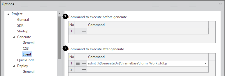 It executes the specified command before or after running Generate and then displays the results in the Output window.