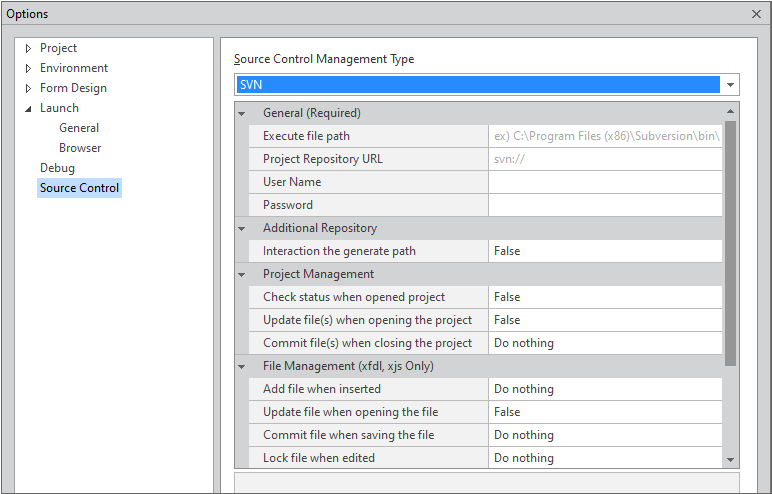 Set up source control options. This option is displayed only when available source control software is installed on user’s computer.