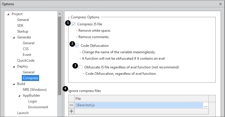 Sets the options for compressing and obfuscating the scripts of a project file to deploy.
