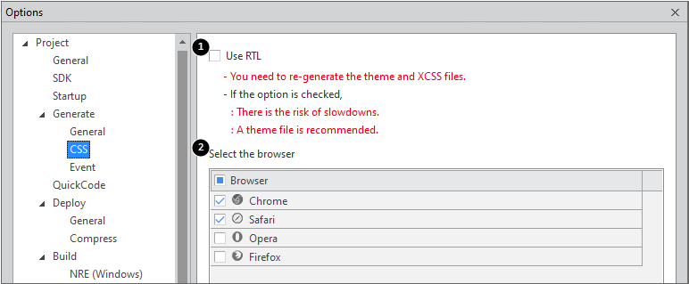 This option determines whether to generate CSS files for the use of the right-to-left (RTL) layout. You must select this option when you use an RTL-related property. If you select this option not from the beginning, you should re-generate theme and XCSS files by yourself.