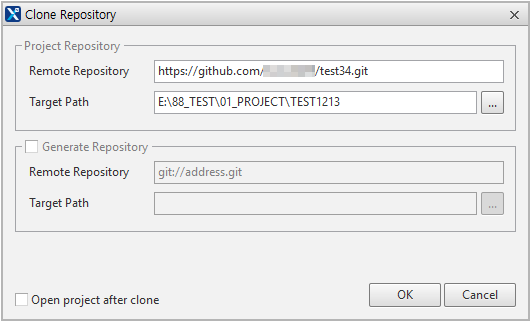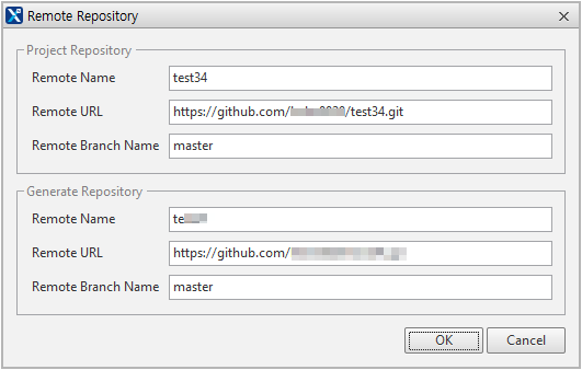 메뉴[Git > Set Remote Repository]를 선택해 원격 저장소 연결을 설정할 수 있습니다. Interact with generate path 옵션을 True로 설정한 경우에는 Generate Repository를 지정할 수 있습니다.