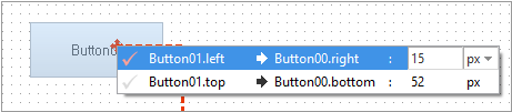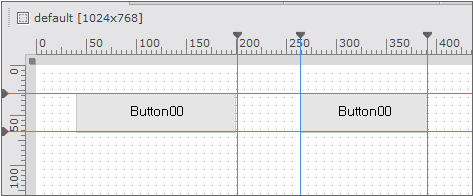 아래 그림의 경우 첫 번째 행에 배치된 Button01 컴포넌트의 left 속성값은 "183"입니다. Button00 컴포넌트의 너비와 간격을 같이 계산해야 합니다. 하지만 두 번째 행에 배치된 Button01 컴포넌트의 left 속성값은 "Button00:28"과 같은 식으로 Base가 되는 컴포넌트와 Base 컴포넌트를 기준으로 간격만 지정합니다.