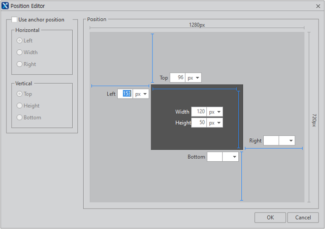 "Use anchor position" 옵션을 선택한 경우에는 원하는 항목을 고정시킨 상태에서 값을 수정할 수 있습니다. 아래 그림과 같은 경우 Left, Top 속성값이 고정된 상태이고 해당 속성값은 지울 수 없습니다.