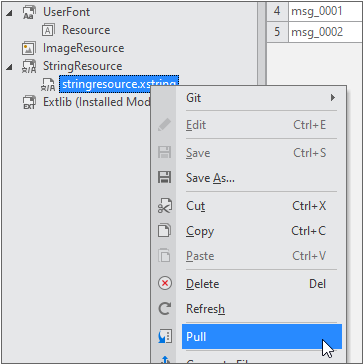 Resource Explorer에서 생성된 stringresource.xstring 파일 항목을 선택하고 컨텍스트 메뉴에서 [pull]을 선택합니다.
