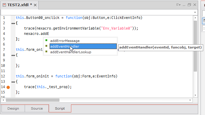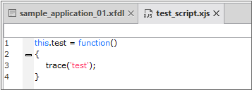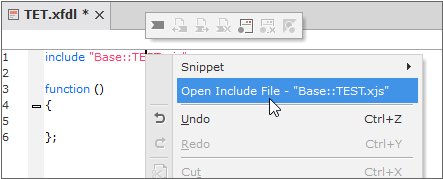 스크립트 내 include 문을 사용해 다른 스크립트를 참조하는 경우에는 해당 스크립트 파일을 바로 열어주는 기능을 제공합니다. include 문 위치에서 오른쪽 마우스를 클릭해 컨텍스트 메뉴를 실행하고 [Open Include File - XX.xjs] 항목을 선택합니다.