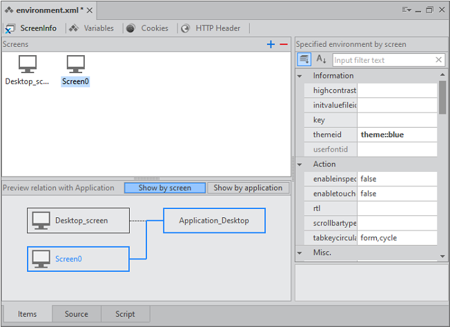 Environment는 Application Information과 별도로 개별 화면을 처리하기 위한 설정을 정의합니다. ScreenDefinition, Variables, Cookies 항목을 지정하며 별도 스크립트를 작성할 수 있습니다.