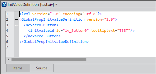 추가된 InitValue 항목은 XML 형태의 파일로 저장됩니다. [Source]탭을 선택하면 작성된 파일을 확인해볼 수 있습니다.
