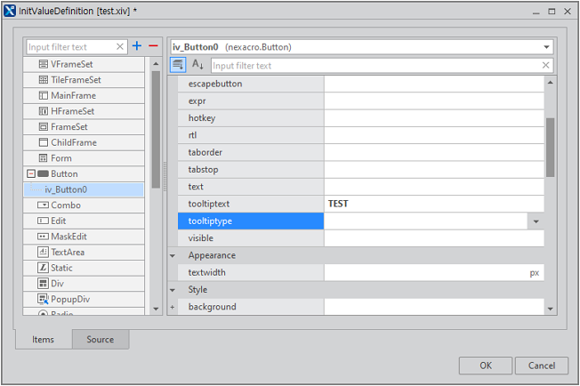 InitValueDefiniton 파일은 앱 내에서 오브젝트 속성값에 대한 최초값을 설정합니다. 파일은 XML 형식으로 제공됩니다. InitValue 편집기는 Resource Explorer에서 InitValueDefiniton 파일을 선택하고 컨텍스트 메뉴에서 [Edit]를 선택해 열 수 있습니다.