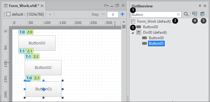 현재 화면에 설정된 탭 순서를 확인하는 기능입니다. 메뉴 [Design > State View > Tab Order] 항목을 선택하면 토글 형식으로 해당 기능을 켜거나 끌 수 있습니다. 기능이 활성화되면 아래 그림과 같이 컴포넌트 왼쪽 윗부분에 2개의 숫자가 표시됩니다.