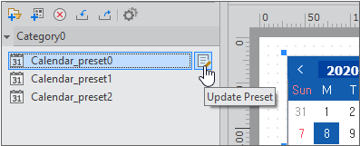 Form에 배치된 컴포넌트를 선택한 상태에서 Component Preset 패널에서 업데이트할 프리셋을 선택합니다. 프리셋 이름 옆에 [Update Preset] 버튼 아이콘이 표시됩니다.