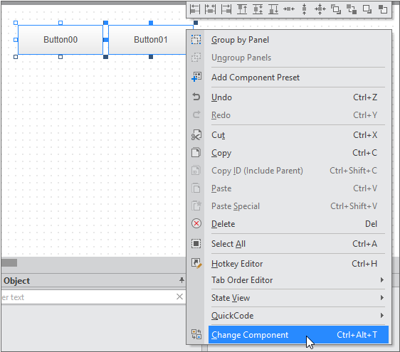 컴포넌트를 선택한 상태에서 컨텍스트 메뉴에서 [Change Component] 항목을 선택합니다. 팝업창에서 변경할 컴포넌트를 선택합니다.