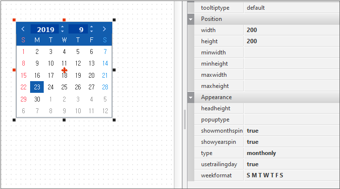 width: 200 height: 200 showmonthspin: true showyearspin: true type: monthonly usetrailingday: true weekformat: S M T W T F S