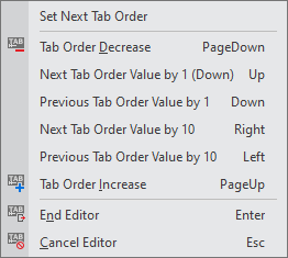 Cancel Editor | Esc | 변경된 내용을 무시하고 Tab Order Edit 모드를 종료합니다. |