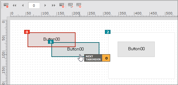 파란색 사각형 안에 표기된 것은 탭 순서를 나타냅니다. 컴포넌트의 taborder 속성을 수정하거나 'Tab Order Editor' 기능을 사용해 순서를 변경할 수 있습니다.