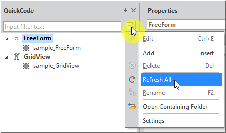 메뉴 [QuickCode > Design > QuickCode Design Mode] 항목을 선택하거나 툴바에서 QuickCode Design Mode 항목을 선택하면 QuickCode Design Mode가 활성화됩니다. Form 화면 오른쪽에 VIew Information 패널이 표시되고 각 View 오브젝트에 대한 정보를 표시합니다.