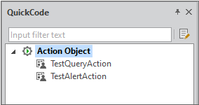 QuickCode 패널에서 Action 탭을 선택하고 TestAlertAction 항목을 선택합니다.