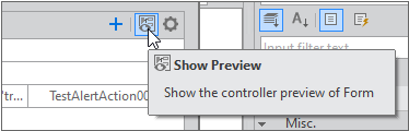 QuickCode Design 모드에서 첫 번째 View 컴포넌트의 버튼을 선택하면 Controller Preview 패널에 추가된 Controller 정보를 확인할 수 있습니다.