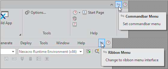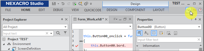 넥사크로스튜디오 설치 시 기본 설정으로 제공되는 메뉴입니다. 관련된 명령이 리본탭에 묶여 있습니다. 상단 메뉴바에서 항목을 선택하면 하단에 필요한 기능 버튼이 화면에 나타납니다.