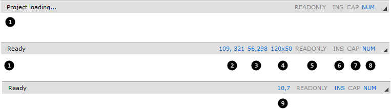 1 | 넥사크로 스튜디오의 상태를 보여주는 메시지 - 생성한 프로젝트를 열거나 닫을 때 진행 상태를 표시합니다. - 메뉴 항목에 마우스 포인터가 멈추었을 때 각 메뉴에 따른 메시지를 표시합니다. |