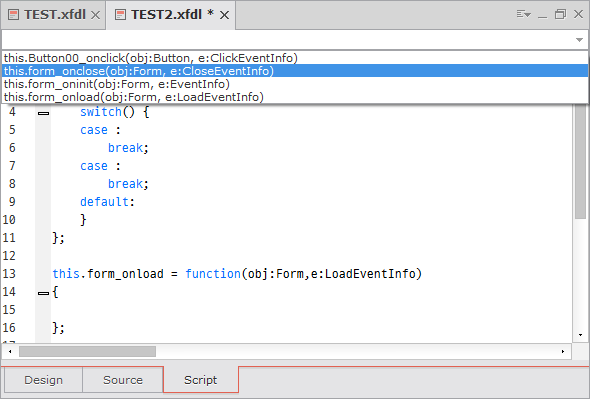 사용하고 있는 함수나 이벤트는 스크립트 편집창 상단의 콤보박스에서 목록으로 제공됩니다. 원하는 항목을 선택하면 해당 항목이 있는 코드 위치로 이동합니다.