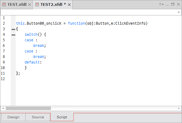 Form의 내용 중 스크립트 영역을 제외한 모든 내용을 XML 형태로 표시하며, XML 소스를 직접 편집해 Form의 내용을 변경할 수 있습니다.