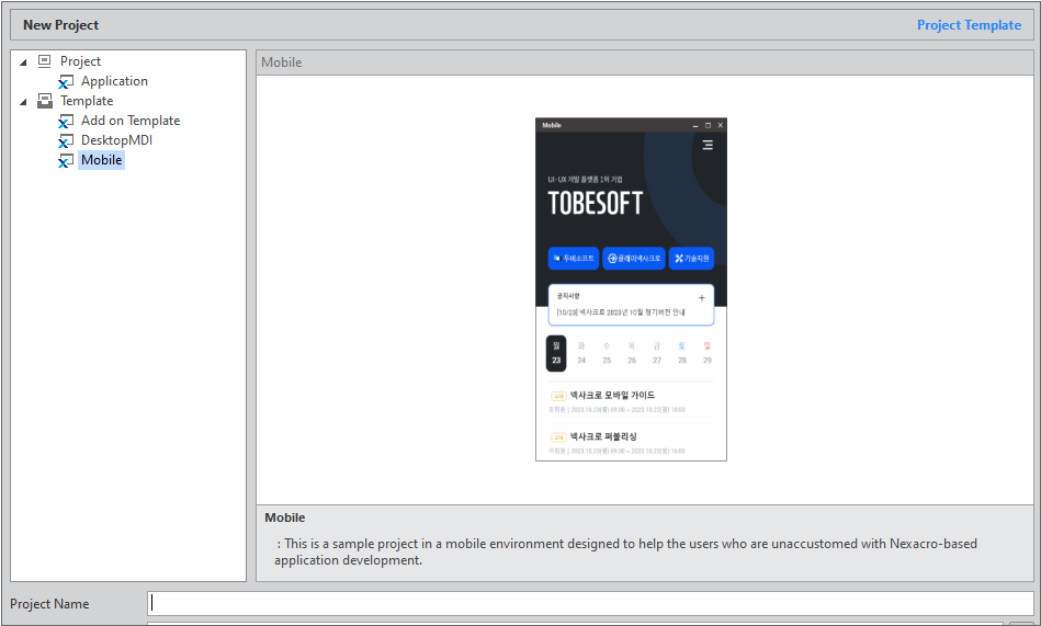 넥사크로 스튜디오 내에서 열려있는 프로젝트 정보를 확인할 수 있는 Add on Template을 제공합니다. 템플릿 프로젝트를 생성하고 생성된 프로젝트는 External Tools에 등록되어 실행됩니다.