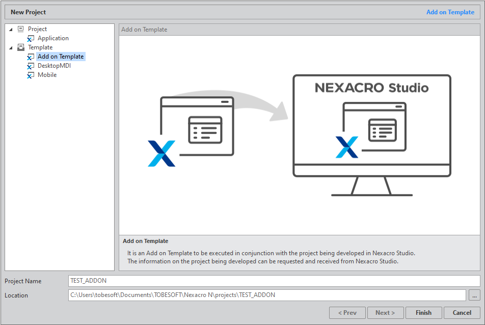 제공되는 템플릿 프로젝트를 수정해서 원하는 형태로 변경할 수 있습니다. Add on은 단독적으로 실행하기 위한 용도는 아니고 넥사크로 스튜디오 내에서 열려있는 프로젝트 정보를 확인하기 위한 용도로만 사용할 수 있습니다.