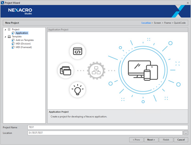 Application 생성 마법사를 이용해 현재 프로젝트에 새로운 Application을 추가 생성할 수 있습니다. 메뉴 [File > New >Application]에서 Application 생성 마법사를 시작합니다.
