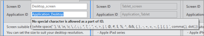 생성된 Application 오브젝트의 screenid 속성값은 "Screen ID" 항목에 입력한 값이 적용됩니다.