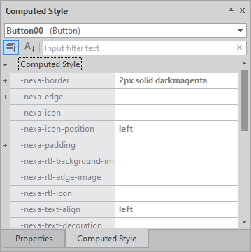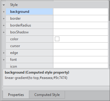 속성 창 하단 탭에서 [Computed Style] 항목을 선택하면 테마, CSS, Style 속성이 처리되어 실제 화면에 적용할 스타일 속성값을 볼 수 있습니다. 아래 항목에서 background 항목은 다른 속성값보다 굵게 표시되는데 이런 항목은 속성창에서 해당 속성값을 직접 수정한 경우입니다.