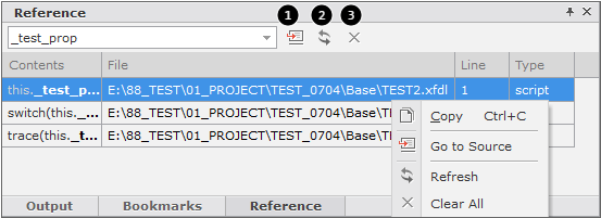 스크립트 창에서 컨텍스트 메뉴 항목 중 [Find Reference]를 선택하면 프로젝트 내에서 해당 문자열과 연관된 파일을 검색하고 사용하는 참조 위치를 표시합니다. 항목을 더블 클릭하면 해당 위치의 편집기를 엽니다.