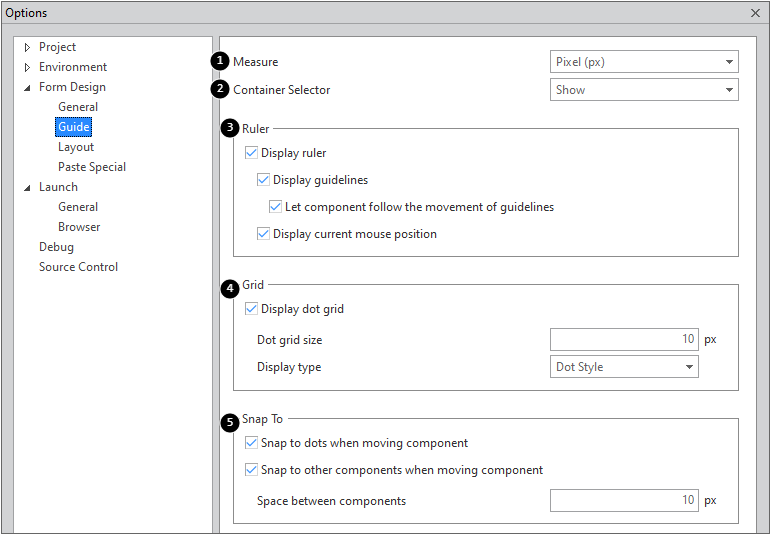 Form 디자인 화면의 눈금자와 가이드 라인, Grid, Snap 기능에 대한 옵션을 설정합니다.