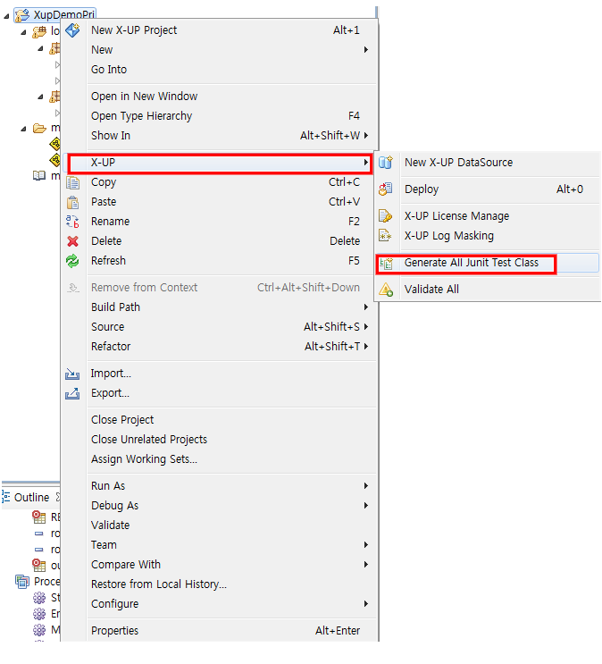 또 다른 방법으로는 프로젝트를 선택한 후에 [Mouse Right-click > X-UP > Generate All Junit Test Class]