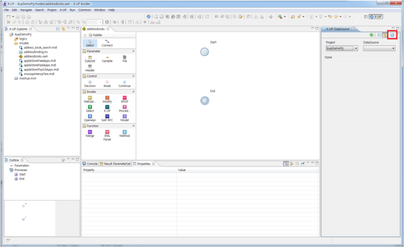 화면 우측의 X-UP DataSource 뷰에서 new DataSource를 선택해 Wizard를 실행합니다.