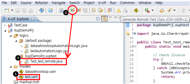 X-UP은 사용자에게 디버깅의 편리성을 제공하기 위한 기능으로 JUnit 클래스와 Remote 클래스를 자동 생성해 주는 기능을 제공하고 있습니다.