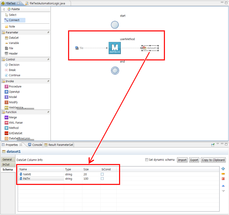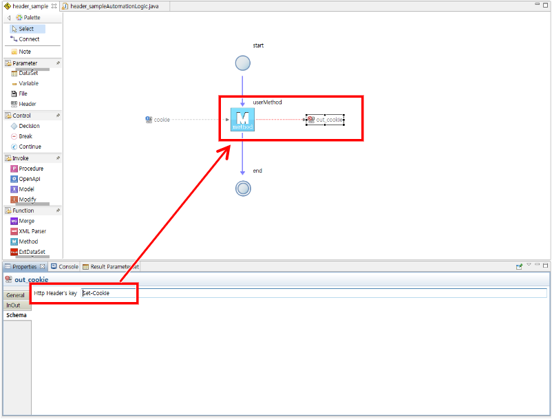 globalParameterSet.add("user_pw",session.getAttribute("USER_PW"));user_id, user_pw Variable을 userMethod에 output 파라메터로 Connect합니다