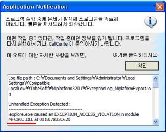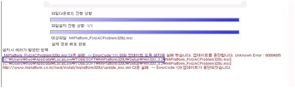 If there exists C:\Windows\System32\MiPlatformBase.ocx file, delete it. C:\Documents and Settings\LogInID\Local Settings\Compatible LocalLow\TOBESOFT\MiPlatform320U\Setup If there are files in directory, delete all. C:\Documents and Settings\LogInID\Local Settings\Compatible LocalLow\TOBESOFT\MiPlatform320U\Ver If there are files in directory, delete all. In Add/Remove Programs of Control Panel, delete InstallBase.msi. Download and install the file linked below. You can have file downloaded by clicking If you finished tasks up to here, you can connect to the relevant site and use it from the beginning.