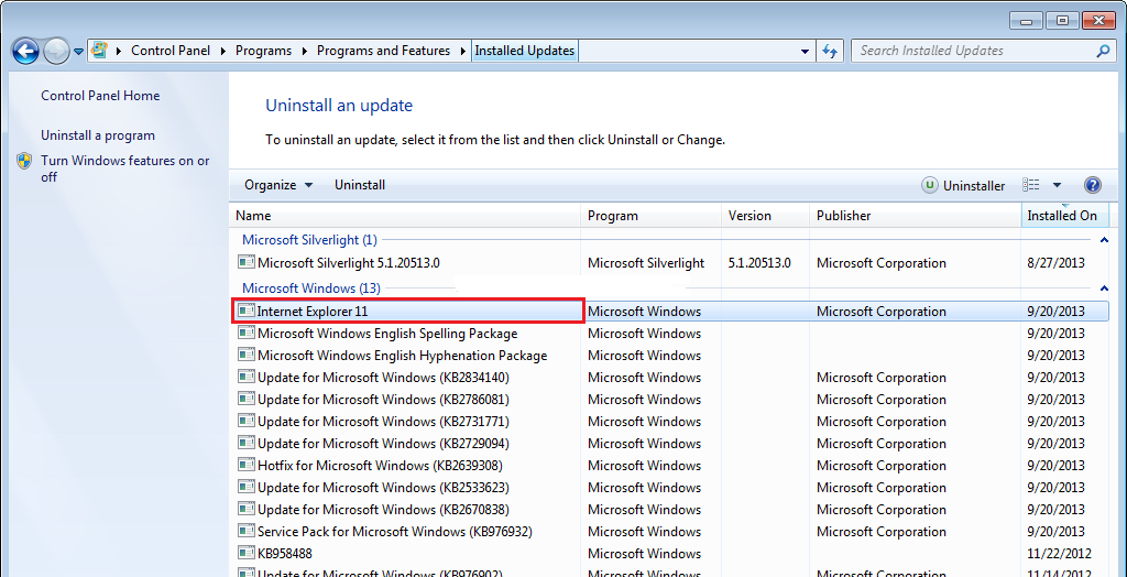 2. In case the same problem is occurred after rebooting, remove the updated IE11.