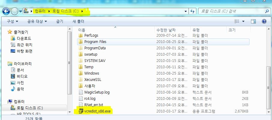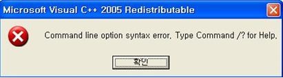 3. Install Microsoft Visual C++ 2005 SP1 redistributable package (vcredist_x86.exe) file. http://www.miplatform.co.kr/faq/data/vcredist_x86.exe Tips: If an error like Command line option systax error... when installing vcredist_x86.exe 1. Copy downloaded vcredist_x86.exe file on c:\ 2. Run command prompt (cmd) and input cd c:\, and enter (In WINDOWS VISTA, 7 OS, run by command prompt administrator authority) 3. Input vcredist_x86 /q /t:c: and enter